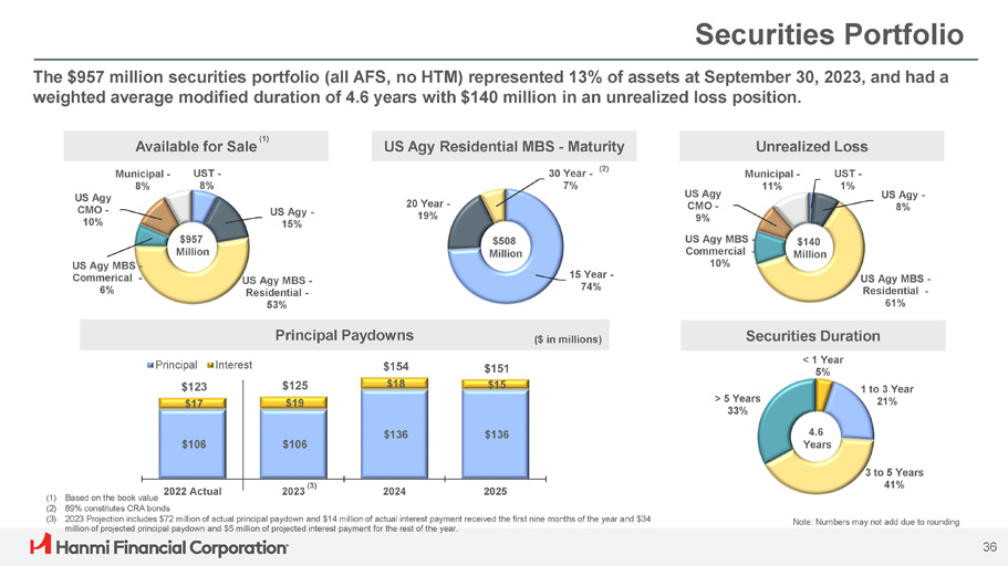ACL Analysis by Loan Type September 30, 2022 December 31, 2022 March 31, 2023 June 30, 2023 September 30, 2023 ($ in millions) Loans Allowance Loans Allowance Loans Allowance Loans Allowance Loans Allowance $ 3,853.9 $ 42.7 $ 3,833.4 $ 40.6 $ 3,784.2 $ 39.2 $ 3,738.3 $ 38.4 $ 3,773.0 $ 38.9 CRE 732.0 14.9 804.5 15.3 778.1 15.3 753.5 16.0 728.8 11.2 C&I 565.4 11.2 594.8 12.2 600.2 13.4 586.4 11.9 592.7 12.3 Equipment Finance 649.6 2.9 734.5 3.4 817.9 4.3 887.0 4.7 926.3 4.9 RRE & Consumer $ 5,801.0 $ 71.6 $ 5,967.1 $ 71.5 $ 5,980.5 $ 72.2 $ 5,965.2 $ 71.0 $ 6,020.8 $ 67.3 Total Note: Numbers may not add due to rounding 35