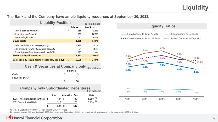 18.1% 1,323 FHLB available borrowing capacity 0.3% 24 FRB discount window borrowing capacity 1.6% 115 Federal funds lines (unsecured) available 20.0% 1,462 Secondary liquidity sources 34.5% $ 2,528 Bank liquidity (liquid assets + secondary liquidity) Cash & Securities at Company only ($ in millions) Balance 289 765 12 % of Assets 3.9% 10.5% 0.2% Cash & cash equivalents Securities (unpledged) Loans held for sale $ Liquid assets 1,066 14.6% Liquid Assets to Total Liabilities Liquidity The Bank and the Company have ample liquidity resources at September 30, 2023. (1) Rate at September 30, 2023, based on 3 - month LIBOR + 140 bps (2) Issued in August 2021 and due in July 2031. Commencing on September 1, 2026, the interest rate will reset quarterly to the three - month SOFR + 310 bps Liquidity Position ($ in millions) 15.2% 16.0% 16.5% 15.5% 14.6% 17.4% 19.7% 19.0% 18.0% 16.8% 17.7% 18.4% 17.3% 17.0% 16.2% 1.5% 1.3% 1.3% 1.3% 1.2% 3Q22 4Q22 1Q23 2Q23 3Q23 Liquid Assets to Total Assets Liquid Assets to Deposits Broker Deposits to Deposits Liquidity Ratios 37 Par Amortized Cost 2036 Trust Preferred Securitites $ 27 $ 22 Rate 6.95% (1) (2) 3.75% 108 110 2031 Subordinated Debt $ 130 $ 137 Company only Subordinated Debentures ($ in millions) Balance Cash Securities (AFS) $ 9 27 $ 36