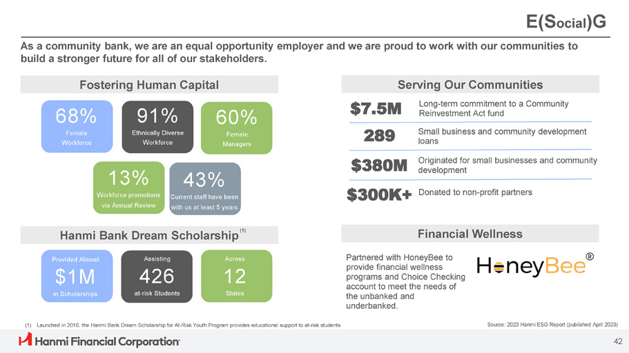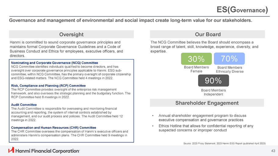 As a community bank, we are an equal opportunity employer and we are proud to work with our communities to build a stronger future for all of our stakeholders. E(S ocial )G Source: 2023 Hanmi ESG Report (published April 2023) Fostering Human Capital 68% Female Workforce 91% Ethnically Diverse Workforce 60% Female Managers 43% Current staff have been with us at least 5 years 13% Workforce promotions via Annual Review Hanmi Bank Dream Scholarship Provided Almost $1M in Scholarships Assisting 426 at - risk Students Across 12 States Serving Our Communities $7.5M Long - term commitment to a Community Reinvestment Act fund 289 Small business and community development loans Financial Wellness $380M Originated for small businesses and community development $300K+ Donated to non - profit partners Partnered with HoneyBee to provide financial wellness programs and Choice Checking account to meet the needs of the unbanked and underbanked. 42 (1) (1) Launched in 2016, the Hanmi Bank Dream Scholarship for At - Risk Youth Program provides educational support to at - risk students