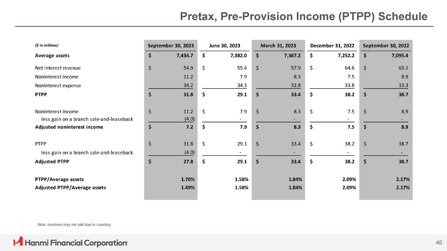 Pretax, Pre - Provision Income (PTPP) Schedule Note: numbers may not add due to rounding June 30, 2023 7,382.0 $ March 31, 2023 $ 7,367.2 September 30, 2022 $ 7,095.4 $ 55.4 $ 7.9 December 31, 2022 $ 7,252.2 57.9 $ 64.6 $ 8.3 7.5 63.1 8.9 34.3 $ 29.1 32.8 $ 33.4 33.8 $ 38.2 33.3 $ 38.7 $ 7.9 $ 8.3 $ 7.5 $ 8.9 - - - - $ 7.9 $ 8.3 $ 7.5 $ 8.9 $ 29.1 $ 33.4 $ 38.2 $ 38.7 - - - - $ 29.1 $ 33.4 $ 38.2 $ 38.7 1.58% 2.09% September 30, 2023 ($ in millions) $ 7,434.7 $ 54.9 11.2 34.2 $ 31.8 $ 11.2 (4.0 ) $ 7.2 $ 31.8 (4.0 ) $ 27.8 1.70% 1.49% Average assets Net interest revenue Noninterest income Noninterest expense PTPP Noninterest income less gain on a branch sale - and - leaseback Adjusted noninterest income PTPP less gain on a branch sale - and - leaseback Adjusted PTPP PTPP/Average assets Adjusted PTPP/Average assets 1.58% 1.84% 1.84% 2.09% 2.17% 2.17% 46