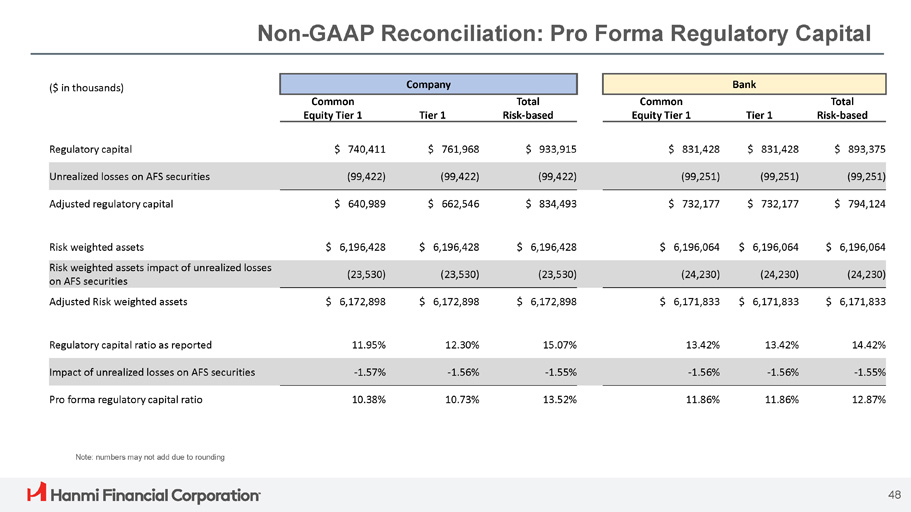 Non - GAAP Reconciliation: Tangible Common Equity to Tangible Asset Ratio 47 (1) There were no preferred shares outstanding at the periods indicated September 30, December 31, March 31, June 30, September 30, 2022 2022 2023 2023 2023 Hanmi Financial Corporation $ 7,128,511 $ 7,378,262 $ 7,434,130 $ 7,344,924 $ 7,350,140 Assets (11,267) (11,225) (11,193) (11,162) (11,131) Less goodwill and other intangible assets $ 7,117,244 $ 7,367,037 $ 7,422,937 $ 7,333,762 $ 7,339,009 Tangible assets $ 608,893 $ 637,515 $ 662,165 $ 668,560 $ 663,359 Stockholders' equity (1) (11,267) (11,225) (11,193) (11,162) (11,131) Less goodwill and other intangible assets $ 597,626 $ 626,290 $ 650,972 $ 657,398 $ 652,228 Tangible stockholders' equity (1) 8.54% 8.64% 8.91% 9.10% 9.03% Stockholders' equity to assets 8.40% 8.50% 8.77% 8.96% 8.89% Tangible common equity to tangible assets (1) 30,484,004 30,485,621 30,555,287 30,485,788 30,410,582 Common shares outstanding $ 19.60 $ 20.54 $ 21.30 $ 21.56 $ 21.45 Tangible common equity per common share ($ in thousands, except per share data)