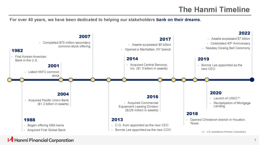 The Hanmi Timeline 1982 - First Korean American Bank in the U.S. 1988 - Began offering SBA loans - Acquired First Global Bank 2001 - Listed HAFC common stock 2004 - Acquired Pacific Union Bank ($1.2 billion in assets) 2007 - Completed $70 million secondary common stock offering 2013 - C.G. Kum appointed as the new CEO - Bonnie Lee appointed as the new COO 2014 - Acquired Central Bancorp, Inc. ($1.3 billion in assets) 2016 - Acquired Commercial Equipment Leasing Division ($228 million in assets) 2017 - Assets surpassed $5 billion - Opened a Manhattan, NY branch 2019 - Bonnie Lee appointed as the new CEO 2022 - Assets surpassed $7 billion - Celebrated 40 th Anniversary - Nasdaq Closing Bell Ceremony For over 40 years, we have been dedicated to helping our stakeholders bank on their dreams . 7 2020 - Launch of USKC (1) - Revitalization of Mortgage Lending (1) U.S. subsidiaries of Korean Corporations 2018 - Opened Chinatown branch in Houston, Texas
