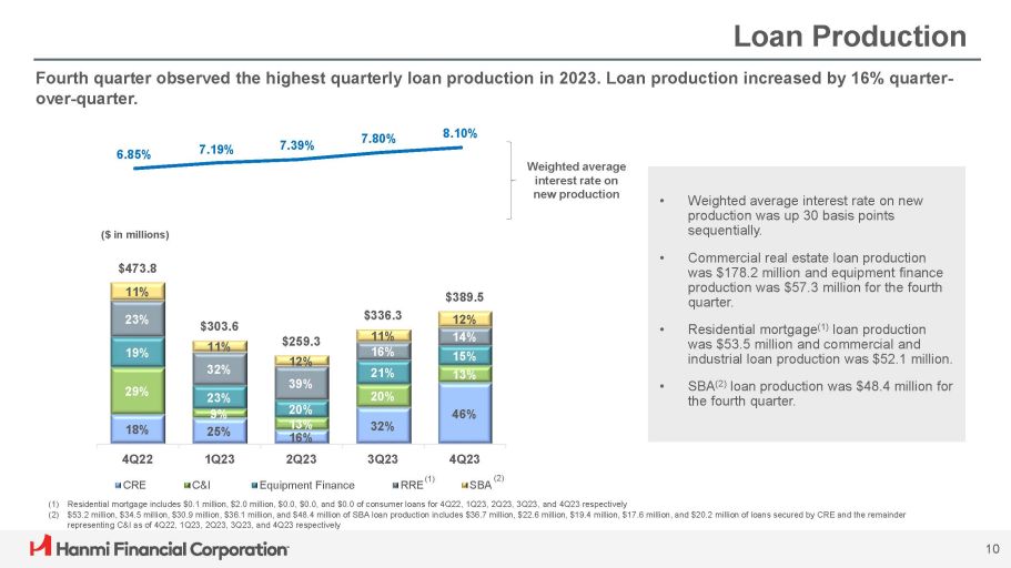 4Q23 Highlights Diluted EPS $0.61 ROAA 0.99% NIM 2.92% Efficiency Ratio 58.86% TBVPS (1) $22.75 Net Income $18.6M • Net income was $18.6 million, or $0.61 per diluted share, down 0.9% from $18.8 million, or $0.62 per diluted share, for the prior quarter » Net interest income was $53.1 million, down 3.1% from the prior quarter » Noninterest income was $6.7 million, down 40.5% from the prior quarter primarily due to the third quarter benefitting from a $4.0 million gain on a branch sale - and - leaseback » Noninterest expense was $35.2 million, up 2.8% from the prior quarter » Efficiency ratio was 58.86%, compared with 51.82% for the prior quarter • Loans receivable were $6.18 billion, up 2.7% from the prior quarter » Loan production was $389.5 million with a weighted average interest rate of 8.10% • Deposits were $6.28 billion, up 0.3% from the prior quarter, with noninterest - bearing demand deposits representing 31.9% of total deposits » Cost of interest - bearing deposits was 3.83%, up 30 basis points from the prior quarter • Credit loss recovery was $2.9 million; allowance for credit losses to loans was 1.12% at December 31, 2023 • Tangible common equity to tangible assets (1) was 9.14%, Common equity tier 1 capital ratio was 11.86% and total capital ratio was 14.95% ROAE 9.70% (1) Non - GAAP financial measure; refer to the non - GAAP reconciliation slide 9