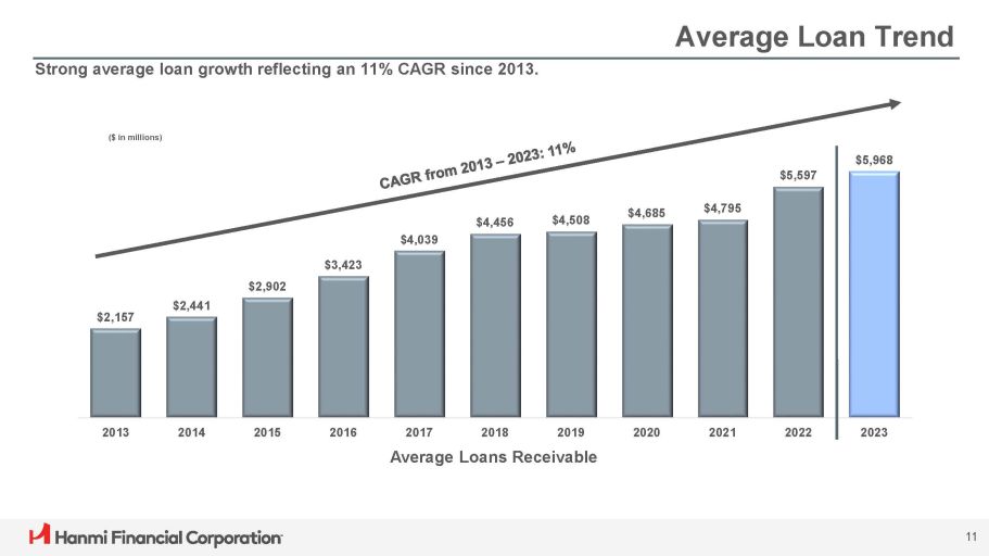 Hanmi Franchise at a Glance Loans $6.2B Deposits $6.3B TCE/TA (2) Ratio 9.14% Second Largest Korean - American Bank in the U.S. • Founded in 1982 in Los Angeles, as the first Korean - American bank • 35 full - service branches and 8 loan production offices across 9 states • Focused on MSAs with high Asian - American and multi - ethnic populations • Strong track record of growth • Well capitalized, significantly above regulatory requirements (1) CAGR based on the average loan growth between 2013, when new executive management was appointed, and 2023 (2) Non - GAAP financial measure; refer to the non - GAAP reconciliation slide Loan Growth (1) 10.7% TBVPS (2) $22.75 As of 4Q23 Total Assets $7.6B Experienced Bankers with Deep Community Ties 3 2 1 1 1 1 7 1 1 Branch Loan Production Office (LPO) 1 22 2 5