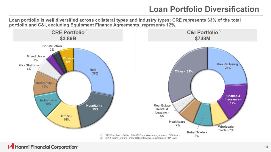 Successful Portfolio Diversification Strategy 12 Loan Composition (as of December 31, 2023) Loan Composition (as of December 31, 2013) $2.23 Billion $6.18 Billion (1) RRE includes Consumer loans (2) $144.5 million or 7.6% and $115.5 million or 3.0% of the CRE portfolio is unguaranteed SBA loans at December 31, 2013 and December 31, 2023, respectively (3) $7.0 million or 3.1% and $61.1 million or 8.2% of the C&I portfolio is unguaranteed SBA loans at December 31, 2013 and December 31, 2023, respectively RRE – 16% Equipment Finance – 9% (1) RRE – 5% Significant progress reducing CRE concentration from 85% of total portfolio to 63%. (1) (2) CRE – 63% C& I ( 3 – ) 12% (2) CRE – 85% (3) C&I – 10%