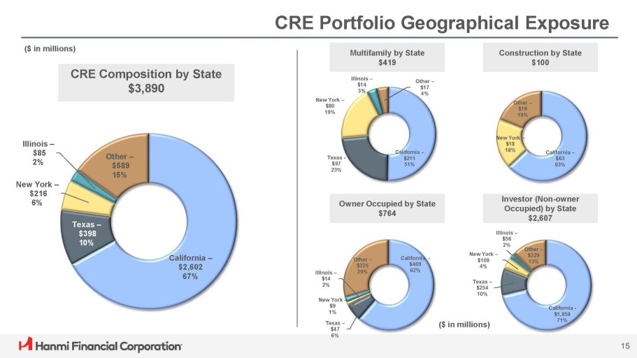 Loan Portfolio Diversification Loan portfolio is well diversified across collateral types and industry types; CRE represents 63% of the total portfolio and C&I, excluding Equipment Finance Agreements, represents 12%. CRE Portfolio (1) $3.89B C&I Portfolio (2) $748M Retail – 28% Hospitality – 19% Office – 15% Industrial – 10% Multifamily – 10% Mixed Use – 3% Gas Station – 6% Construction 3% Other – 6% Manufacturing - 24% 14 Finance & Insurance - 17% Wholesale Trade - 7% Retail Trade - 8% Real Estate Rental & Leasing - 5% Healthcare - 7% Other - 32% (1) $115.5 million, or 3.0%, of the CRE portfolio are unguaranteed SBA loans (2) $61.1 million, or 8.2%, of the C&I portfolio are unguaranteed SBA loans