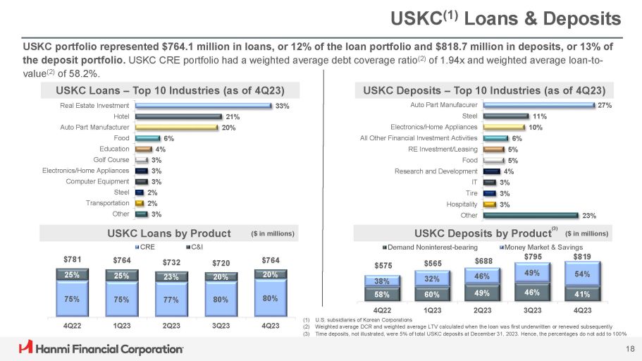 USKC (1) Loans & Deposits 33% 21% 20% 6% 4% 3% 3% 3% 2% 2% 3% Real Estate Investment Hotel Auto Part Manufacturer Food Education Golf Course Electronics/Home Appliances Computer Equipment Steel Transportation Other USKC portfolio represented $764.1 million in loans, or 12% of the loan portfolio and $818.7 million in deposits, or 13% of the deposit portfolio. USKC CRE portfolio had a weighted average debt coverage ratio (2) of 1.94x and weighted average loan - to - value (2) of 58.2%. USKC Loans – Top 10 Industries (as of 4Q23) 75% 75% 77% 80% 80% $781 25% $764 25% $732 23% $720 20% $764 20% U.S. subsidiaries of Korean Corporations Weighted average DCR and weighted average LTV calculated when the loan was first underwritten or renewed subsequently (1) (2) 4Q23 3Q23 2Q23 1Q23 4Q22 Time deposits, not illustrated, were 5% of total USKC deposits at December 31, 2023. Hence, the percentages do not add to 100% (3) CRE C&I USKC Loans by Product ($ in millions) USKC Deposits – Top 10 Industries (as of 4Q23) 27% Auto Part Manufacurer 11% Steel 10% Electronics/Home Appliances 6% All Other Financial Investment Activities 5% RE Investment/Leasing 5% Food 4% Research and Development 3% IT 3% Tire 3% Hospitality 23% Other 49% 46% 41% $575 38% 58% $565 32% 60% $688 46% $795 $819 49% 54% 4Q22 1Q23 2Q23 3Q23 4Q23 Demand Noninterest - bearing Money Market & Savings USKC Deposits by Product 18 ($ in millions) (3)