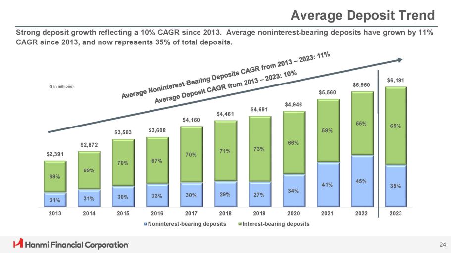 Hanmi Financial Corporation (the “Company”) cautions investors that any statements contained herein that are not historical facts are forward - looking statements within the meaning of the “safe harbor” provisions of the Private Securities Litigation Reform Act of 1995 , including, but not limited to, those statements regarding operating and financial performance, financial position and liquidity, business strategies, regulatory, economic and competitive outlook, investment and expenditure plans, capital and financing needs and availability, litigation, plans and objectives, merger or sale activity, financial condition and results of operations, and all other forecasts and statements of expectation or assumption underlying any of the foregoing . These statements involve known and unknown risks and uncertainties that are difficult to predict . Investors should not rely on any forward - looking statement and should consider risks, such as changes in governmental policy, legislation and regulations, economic uncertainty and changes in economic conditions, inflation, the continuing impact of the COVID - 19 pandemic on our business and results of operations, fluctuations in interest rate and credit risk, competitive pressures, the ability to succeed in new markets, balance sheet management, liquidity and sources of funding, the size and composition of our deposit portfolio, including the percentage of uninsured deposits in the portfolio, increased assessments by the Federal Deposit Insurance Corporation, risk of natural disasters, a failure in or breach of our operational or security systems or infrastructure, including cyberattacks, the adequacy of our allowance for credit losses, and other operational factors . Forward - looking statements are based upon the good faith beliefs and expectations of management as of this date only and are further subject to additional risks and uncertainties, including, but not limited to, the risk factors set forth in our earnings release dated January 23 , 2024 , including the section titled “Forward Looking Statements and the Company’s most recent Form 10 - K, 10 - Q and other filings with the Securities and Exchange Commission (“SEC”) . Investors are urged to review our earnings release dated January 23 , 2024 , including the section titled “Forward Looking Statements and the Company’s SEC filings . The Company disclaims any obligation to update or revise the forward - looking statements herein . 2 Forward - Looking Statements