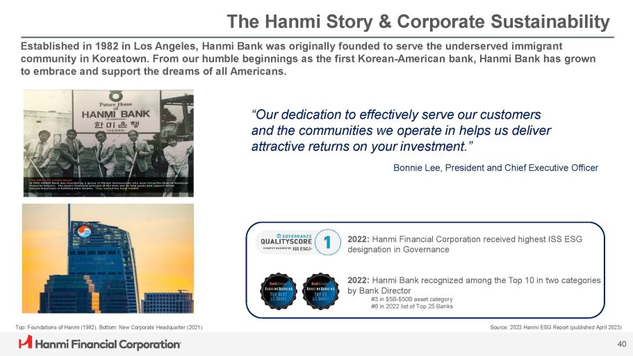 The Hanmi Story & Corporate Sustainability Established in 1982 in Los Angeles, Hanmi Bank was originally founded to serve the underserved immigrant community in Koreatown. From our humble beginnings as the first Korean - American bank, Hanmi Bank has grown to embrace and support the dreams of all Americans. “Our dedication to effectively serve our customers and the communities we operate in helps us deliver attractive returns on your investment.” Bonnie Lee, President and Chief Executive Officer 2022: Hanmi Financial Corporation received highest ISS ESG designation in Governance Top: Foundations of Hanmi (1982). Bottom: New Corporate Headquarter (2021) Source: 2023 Hanmi ESG Report (published April 2023) 40 2022: Hanmi Bank recognized among the Top 10 in two categories by Bank Director #3 in $5B - $50B asset category #6 in 2022 list of Top 25 Banks