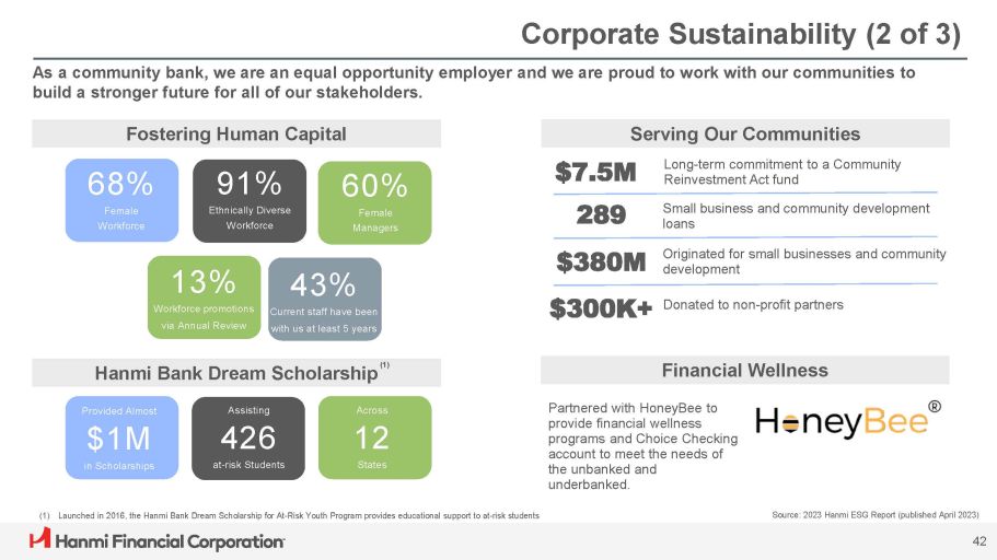 As a community bank, we are an equal opportunity employer and we are proud to work with our communities to build a stronger future for all of our stakeholders. Corporate Sustainability (2 of 3) Source: 2023 Hanmi ESG Report (published April 2023) Fostering Human Capital 68% Female Workforce 91% Ethnically Diverse Workforce 60% Female Managers 43% Current staff have been with us at least 5 years 13% Workforce promotions via Annual Review Hanmi Bank Dream Scholarship Provided Almost $1M in Scholarships Assisting 426 at - risk Students Across 12 States Serving Our Communities $7.5M Long - term commitment to a Community Reinvestment Act fund 289 Small business and community development loans Financial Wellness $380M Originated for small businesses and community development $300K+ Donated to non - profit partners Partnered with HoneyBee to provide financial wellness programs and Choice Checking account to meet the needs of the unbanked and underbanked. 42 (1) (1) Launched in 2016, the Hanmi Bank Dream Scholarship for At - Risk Youth Program provides educational support to at - risk students
