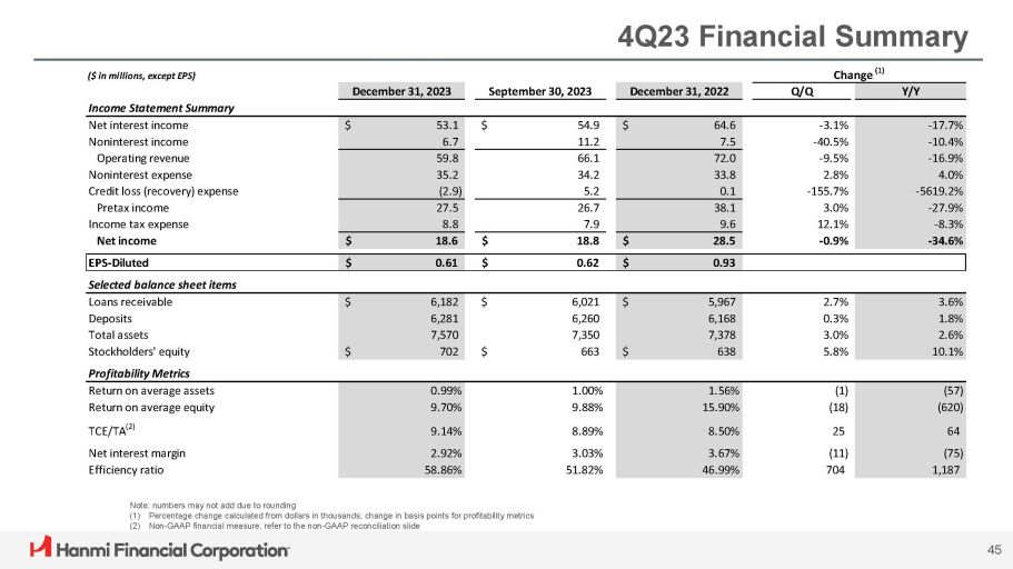 4Q23 Financial Summary Note: numbers may not add due to rounding (1) Percentage change calculated from dollars in thousands; change in basis points for profitability metrics (2) Non - GAAP financial measure, refer to the non - GAAP reconciliation slide $ 0.93 $ 0.62 $ 0.61 EPS - Diluted ($ in millions, except EPS) Change (1) December 31, 2023 September 30, 2023 December 31, 2022 Q/Q Y/Y Income Statement Summary - 17.7% - 3.1% $ 64.6 $ 54.9 $ 53.1 Net interest income - 10.4% - 40.5% 7.5 11.2 6.7 Noninterest income - 16.9% - 9.5% 72.0 66.1 59.8 Operating revenue 4.0% 2.8% 33.8 34.2 35.2 Noninterest expense - 5619.2% - 155.7% 0.1 5.2 (2.9) Credit loss (recovery) expense - 27.9% 3.0% 38.1 26.7 27.5 Pretax income - 8.3% 12.1% 9.6 7.9 8.8 Income tax expense - 34.6% - 0.9% $ 28.5 $ 18.8 $ 18.6 Net income Selected balance sheet items 3.6% 2.7% $ 5,967 $ 6,021 $ 6,182 Loans receivable 1.8% 0.3% 6,168 6,260 6,281 Deposits 2.6% 3.0% 7,378 7,350 7,570 Total assets 10.1% 5.8% $ 638 $ 663 $ 702 Stockholders' equity Profitability Metrics (57) (1) 1.56% 1.00% 0.99% Return on average assets (620) (18) 15.90% 9.88% 9.70% Return on average equity 64 25 8.50% 8.89% 9.14% TCE/TA (2) (75) (11) 3.67% 3.03% 2.92% Net interest margin 1,187 704 46.99% 51.82% 58.86% Efficiency ratio 45