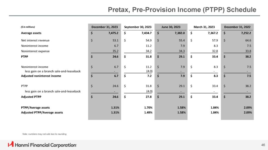 Pretax, Pre - Provision Income (PTPP) Schedule Note: numbers may not add due to rounding March 31, 2023 December 31, 2023 $ 7,475.2 7,367.2 June 30, 2023 $ 7,382.0 $ December 31, 2022 $ 7,252.2 $ 57.9 $ September 30, 2023 $ 7,434.7 53.1 $ 54.9 $ 6.7 11.2 55.4 $ 7.9 8.3 64.6 7.5 35.2 $ 24.6 34.2 $ 31.8 34.3 $ 29.1 32.8 $ 33.4 33.8 $ 38.2 $ 6.7 $ 11.2 - (4.0 ) $ 6.7 $ 7.2 $ 7.9 $ 8.3 $ 7.5 - - - $ 7.9 $ 8.3 $ 7.5 $ 24.6 - $ 24.6 $ 31.8 (4.0 ) $ 27.8 $ 29.1 - $ 29.1 $ 33.4 - $ 33.4 $ 38.2 - $ 38.2 1.70% 1.84% ($ in millions) Average assets Net interest revenue Noninterest income Noninterest expense PTPP Noninterest income less gain on a branch sale - and - leaseback Adjusted noninterest income PTPP less gain on a branch sale - and - leaseback Adjusted PTPP PTPP/Average assets Adjusted PTPP/Average assets 1.31% 1.31% 1.49% 1.58% 1.58% 1.84% 2.09% 2.09% 46