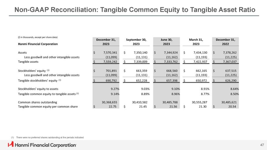 Non - GAAP Reconciliation: Tangible Common Equity to Tangible Asset Ratio 47 (1) There were no preferred shares outstanding at the periods indicated December 31, March 31, June 30, September 30, December 31, 2022 2023 2023 2023 2023 Hanmi Financial Corporation $ 7,378,262 $ 7,434,130 $ 7,344,924 $ 7,350,140 $ 7,570,341 Assets (11,225) (11,193) (11,162) (11,131) (11,099) Less goodwill and other intangible assets $ 7,367,037 $ 7,422,937 $ 7,333,762 $ 7,339,009 $ 7,559,242 Tangible assets $ 637,515 $ 662,165 $ 668,560 $ 663,359 $ 701,891 Stockholders' equity (1) (11,225) (11,193) (11,162) (11,131) (11,099) Less goodwill and other intangible assets $ 626,290 $ 650,972 $ 657,398 $ 652,228 $ 690,792 Tangible stockholders' equity (1) 8.64% 8.91% 9.10% 9.03% 9.27% Stockholders' equity to assets 8.50% 8.77% 8.96% 8.89% 9.14% Tangible common equity to tangible assets (1) 30,485,621 30,555,287 30,485,788 30,410,582 30,368,655 Common shares outstanding $ 20.54 $ 21.30 $ 21.56 $ 21.45 $ 22.75 Tangible common equity per common share ($ in thousands, except per share data)
