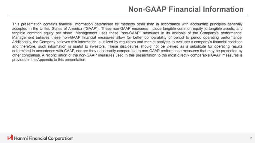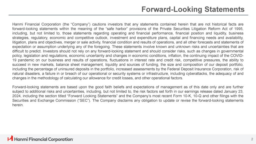 Hanmi Financial Corporation (the “Company”) cautions investors that any statements contained herein that are not historical facts are forward - looking statements within the meaning of the “safe harbor” provisions of the Private Securities Litigation Reform Act of 1995 , including, but not limited to, those statements regarding operating and financial performance, financial position and liquidity, business strategies, regulatory, economic and competitive outlook, investment and expenditure plans, capital and financing needs and availability, litigation, plans and objectives, merger or sale activity, financial condition and results of operations, and all other forecasts and statements of expectation or assumption underlying any of the foregoing . These statements involve known and unknown risks and uncertainties that are difficult to predict . Investors should not rely on any forward - looking statement and should consider risks, such as changes in governmental policy, legislation and regulations, economic uncertainty and changes in economic conditions, inflation, the continuing impact of the COVID - 19 pandemic on our business and results of operations, fluctuations in interest rate and credit risk, competitive pressures, the ability to succeed in new markets, balance sheet management, liquidity and sources of funding, the size and composition of our deposit portfolio, including the percentage of uninsured deposits in the portfolio, increased assessments by the Federal Deposit Insurance Corporation, risk of natural disasters, a failure in or breach of our operational or security systems or infrastructure, including cyberattacks, the adequacy of and changes in the methodology of calculating our allowance for credit losses, and other operational factors . Forward - looking statements are based upon the good faith beliefs and expectations of management as of this date only and are further subject to additional risks and uncertainties, including, but not limited to, the risk factors set forth in our earnings release dated January 23 , 2024 , including the section titled “Forward Looking Statements” and the Company’s most recent Form 10 - K, 10 - Q and other filings with the Securities and Exchange Commission (“SEC”) . The Company disclaims any obligation to update or revise the forward - looking statements herein . 2 Forward - Looking Statements