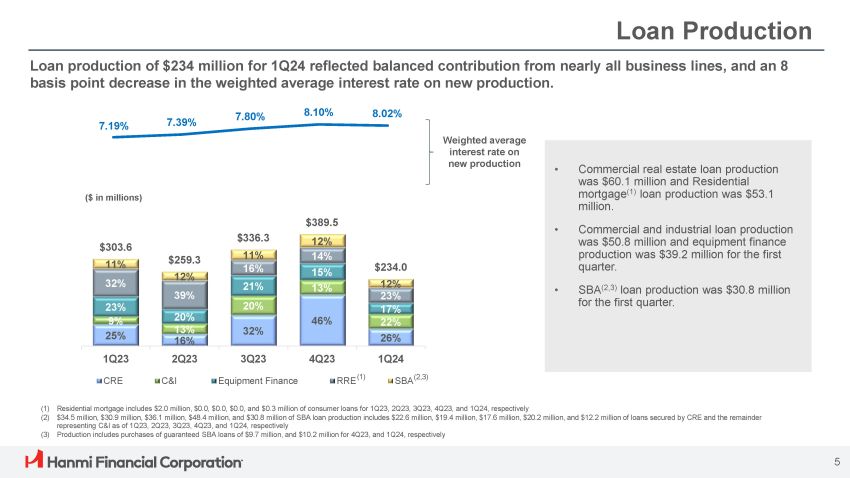 1Q24 Highlights Diluted EPS $0.50 ROAA 0.81% NIM 2.78% Efficiency Ratio 62.42% TBVPS (1) $22.86 Net Income $15.2M • Net income was $15.2 million, or $0.50 per diluted share, down 18.6% from $18.6 million, or $0.61 per diluted share, for the prior quarter » Net interest income was $50.7 million, down 4.7% from the prior quarter » Noninterest income was $7.7 million, up 15.8% from the prior quarter » Noninterest expense was $36.4 million, up 3.5% from the prior quarter » Efficiency ratio was 62.42%, compared with 58.86% for the prior quarter • Loans receivable were $6.18 billion, consistent with the prior quarter » Loan production was $234.0 million with a weighted average interest rate of 8.02% • Deposits were $6.38 billion, up 1.5% from the prior quarter, with noninterest - bearing demand deposits representing 30.3% of total deposits » Cost of interest - bearing deposits was 4.16%, up 33 basis points from the prior quarter • Credit loss expense was $0.2 million; allowance for credit losses to loans was 1.11% at March 31, 2024 • Tangible common equity to tangible assets (1) was 9.23%, Common equity tier 1 capital ratio was 12.05% and total capital ratio was 15.20% ROAE 7.90% (1) Non - GAAP financial measure; refer to the non - GAAP reconciliation slide 4