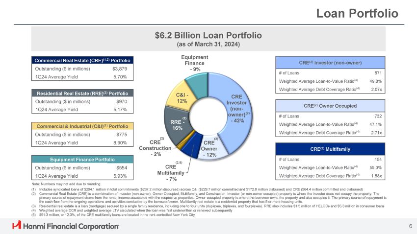 32% 46% 23% 9% 25% 11% 16% 21% 20% $303.6 11% 32% $259.3 12% 39% 20% 13% 16% $336.3 $389.5 12% 14% 15% 13% $234.0 12% 23% 17% 22% 26% 1Q23 2Q23 3Q23 4Q23 CRE C&I Equipment Finance RRE (1) 1Q24 SBA (2,3) 7.19% 7.39% 7.80% 8.10% 8.02% Loan Production • Commercial real estate loan production was $60.1 million and Residential mortgage (1) loan production was $53.1 million. • Commercial and industrial loan production was $50.8 million and equipment finance production was $39.2 million for the first quarter. • SBA (2,3) loan production was $30.8 million for the first quarter. Loan production of $234 million for 1Q24 reflected balanced contribution from nearly all business lines, and an 8 basis point decrease in the weighted average interest rate on new production. Weighted average interest rate on new production (1) Residential mortgage includes $2.0 million, $0.0, $0.0, $0.0, and $0.3 million of consumer loans for 1Q23, 2Q23, 3Q23, 4Q23, and 1Q24, respectively (2) $34.5 million, $30.9 million, $36.1 million, $48.4 million, and $30.8 million of SBA loan production includes $22.6 million, $19.4 million, $17.6 million, $20.2 million, and $12.2 million of loans secured by CRE and the remainder representing C&I as of 1Q23, 2Q23, 3Q23, 4Q23, and 1Q24, respectively (3) Production includes purchases of guaranteed SBA loans of $9.7 million, and $10.2 million for 4Q23, and 1Q24, respectively 5 ($ in millions)