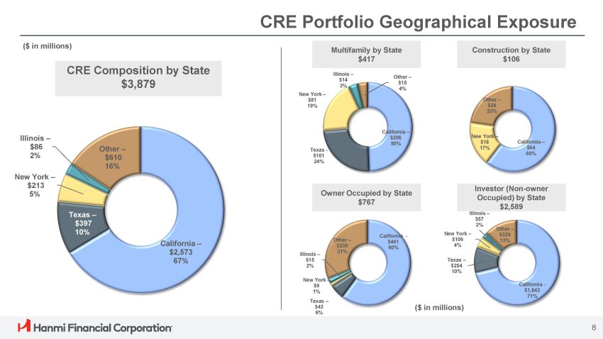 Loan Portfolio Diversification Loan portfolio is well diversified across collateral and industry types; CRE represents 63% of the total portfolio and C&I, excluding Equipment Finance Agreements, represents 12%. CRE Portfolio (1) $3.9B C&I Portfolio (2) $775M Retail – 28% Hospitality – 19% Office – 15% Industrial – 10% Multifamily – 10% Gas Station – 6% Construction 3% Mixed Use – 3% Other – 6% Manufacturing - 26% 7 Finance & Insurance - 14% Wholesale Trade - 7% Retail Trade - 7% Healthcare - 7% Real Estate Rental & Leasing - 4% Other - 35% (1) $111.7 million, or 2.7%, of the CRE portfolio are unguaranteed SBA loans (2) $47.7 million, or 6.2%, and $28.8 million, or 3.7%, of the C&I portfolio are unguaranteed and guaranteed SBA loans, respectively