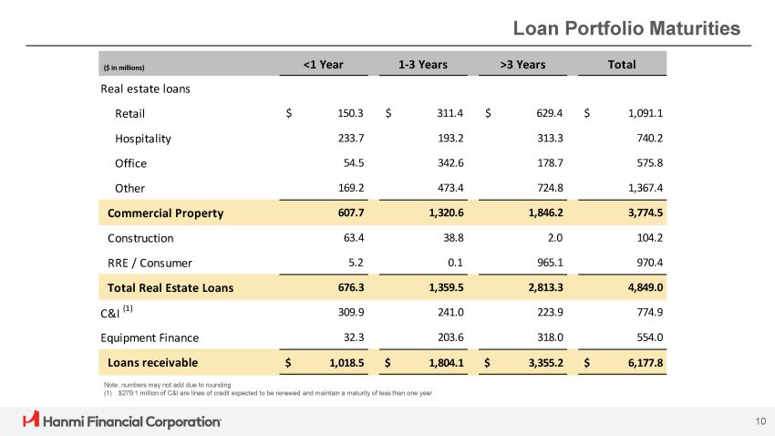 Loan Portfolio Distribution CRE C&I ($ in millions) ($ in millions) Construction (1) Multifamily Non - owner Occupied Owner Occupied $106 $417 $2,589 $767 Total Balance $9.59 $2.71 $2.97 $1.05 Average $1.99 $1.09 $1.12 $0.33 Median $59 $302 $1,847 $579 (3) Top Quintile Balance $18.3 or more $2.5 or more $3.7 or more $1.2 or more Top Quintile Loan Size $29.55 $9.75 $10.74 $3.99 Top Quintile Average $29.55 $4.23 $6.87 $2.15 Top Quintile Median Lines of Credit (2) Term (2) $409 $366 Total Balance $0.68 $0.35 Average $0.05 $0.06 Median $358 $321 Top Quintile Balance (3) $0.6 or more $0.1 or more Top Quintile Loan Size $4.12 $1.57 Top Quintile Average $1.43 $0.26 Top Quintile Median Residential Real Estate & Equipment Finance 9 Equipment Finance Residential Real Estate $554 $970 Total Balance $0.05 $0.53 Average $0.03 $0.46 Median $283 $399 Top Quintile Balance (3) $0.1 or more $0.7 or more Top Quintile Loan Size $0.12 $1.11 Top Quintile Average $0.10 $0.91 Top Quintile Median ($ in millions) (1) Represents the total outstanding amount. Advances require authorization and disbursement requests, depending on the progress of the project and inspections. Advances are non - revolving and are made throughout the term, up to the original commitment amount (2) Term loans are a commitment for a specified term. Majority of the Lines of Credit are revolving, including commercial revolvers, with some non - revolvers (sub - notes and working capital tranches) (3) Top quintile represents top 20% of the loans