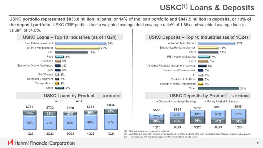 USKC (1) Loans & Deposits 30% 26% 19% 5% 3% 3% 3% 2% 2% 2% 5% Real Estate Investment Auto Part Manufacturer Hotel Food Education Electronics/Home Appliances Steel Golf Course Computer Equipment Transportation Other USKC portfolio represented $833.8 million in loans, or 14% of the loan portfolio and $847.5 million in deposits, or 13% of the deposit portfolio. USKC CRE portfolio had a weighted average debt coverage ratio (2) of 1.85x and weighted average loan - to - value (2) of 54.6%. USKC Loans – Top 10 Industries (as of 1Q24) $834 $764 $720 $732 $764 24% 20% 20% 23% 25% 76% 80% 80% 77% 75% 1Q24 4Q23 3Q23 2Q23 1Q23 USKC Loans by Product CRE C&I ($ in millions) USKC Deposits – Top 10 Industries (as of 1Q24) 22% Auto Part Manufacurer 12% Electronics/Home Appliances 12% Steel 7% RE Investment/Leasing 6% Food 5% All Other Financial Investment Activities 3% Research and Development 3% IT 3% Electrical Auto Parts 3% Foreign Financial Information 24% Other $848 $819 $795 $688 $565 62% 54% 49% 46% 32% 34% 41% 46% 49% 60% 1Q24 4Q23 3Q23 2Q23 1Q23 Demand Noninterest - bearing Money Market & Savings USKC Deposits by Product 11 ($ in millions) (1) U.S. subsidiaries of Korean Corporations (2) Weighted average DCR and weighted average LTV calculated when the loan was first underwritten or renewed subsequently (3) Time deposits, not illustrated, represent the remainder to add to 100%. (3)
