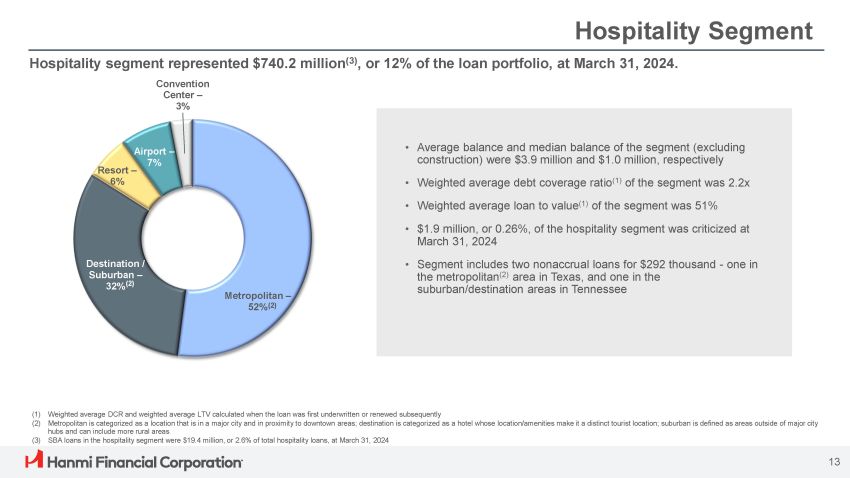 Office Loan Portfolio The CRE office portfolio (1) was $575.8 million (3) at March 31, 2024, representing 9% of the total loan portfolio. 81% 12% 3% Remaining = 3% 1% Portfolio by State • Average balance and median balance of the portfolio were $4.5 million and $1.0 million, respectively • Weighted average debt coverage ratio (2) of the segment was 2.03x • Weighted average loan to value (2) of the segment was 56.29% • $57.9 million, or 10.1%, of the office loans are located in the Central Business District (CBD) (4) ; all are current with $52.4 million at an adjustable rate of interest and the remainder at a fixed rate of interest • No delinquent loans • Criticized loans represented 1.53% of the office portfolio Rate Distribution (1) Segment represents exposure in CRE and excludes $18.3 million in construction. 7.7% of the portfolio is owner occupied (2) Weighted average DCR and weighted average LTV calculated when the loan was first underwritten or renewed subsequently (3) SBA CRE office loans were $7.3 million, or 1.3% of total office loans, at March 31, 2024 (4) Central Business Districts (CBD) include Los Angeles and Minneapolis 66% 34% Fixed Variable 12