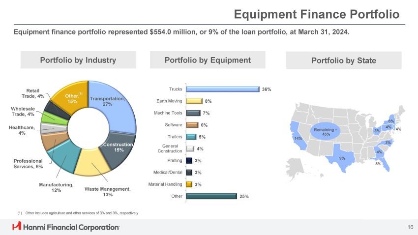 Equipment Finance Portfolio Equipment finance portfolio represented $554.0 million, or 9% of the loan portfolio, at March 31, 2024. Transportation, 27% Construction, 15% Waste Management, 13% Manufacturing, 12% Professional Services, 6% Healthcare, 4% Wholesale Trade, 4% Retail Trade, 4% Other, (1) 15% 8% 7% 6% 5% 4% 3% Trucks Earth Moving Machine Tools Software Trailers General Construction Printing 3% Medical/Dental 3% Material Handling 25% Other 36% Portfolio by Industry Portfolio by Equipment Portfolio by State 14% 16 9% 4% 8% 6% 4% 3% 3% Remaining = 45% 4% (1) Other includes agriculture and other services of 3% and 3%, respectively