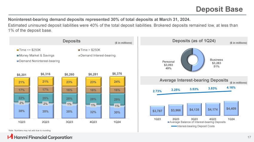2.73% 3.25% 3.53% 3.83% 4.16% 2Q23 3Q23 4Q23 Average Balance of Interest - bearing Deposits Interest - bearing Deposit Costs $3,787 $3,966 $4,135 $4,174 $4,409 1Q23 1Q24 Deposit Base Noninterest - bearing demand deposits represented 30% of total deposits at March 31, 2024. Estimated uninsured deposit liabilities were 40% of the total deposit liabilities. Brokered deposits remained low, at less than 1% of the deposit base. Note: Numbers may not add due to rounding Deposits ($ in millions) Deposits (as of 1Q24) Average Interest - bearing Deposits ($ in millions) Business $3,283 51% Personal $3,093 49% ($ in millions) 38% 32% 30% 2% 1% 1% 22% 25% 25% 1% 2% 35% 35% 28% 29% $6,37 $6,281 $6,260 $6,316 $6,201 24% 23% 23% 21% 21% 16% 16% 16% 17% 17% 6 1Q23 2Q23 3Q23 4Q23 1Q24 Time <= $250K Money Market & Savings Demand Noninterest - bearing Time > $250K Demand Interest - bearing 17