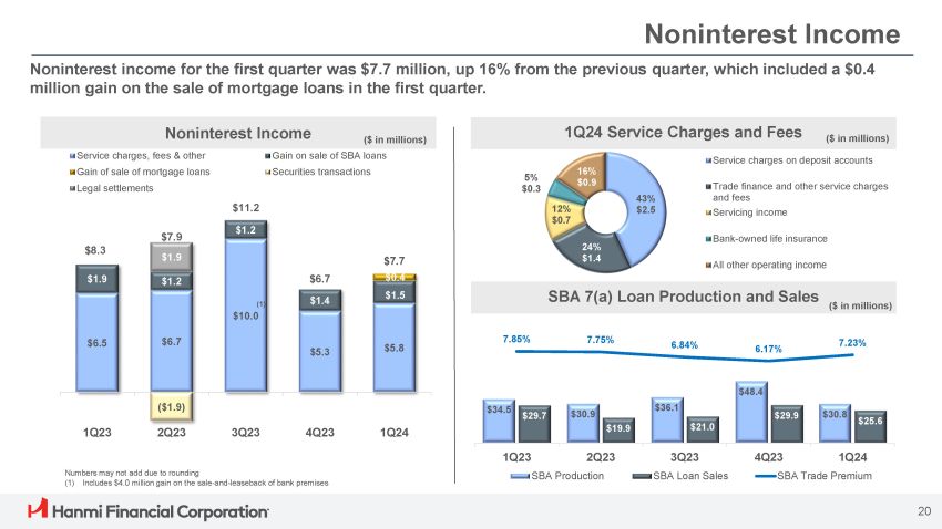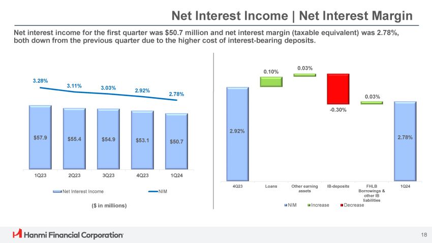Net Interest Income | Net Interest Margin Net interest income for the first quarter was $50.7 million and net interest margin (taxable equivalent) was 2.78%, both down from the previous quarter due to the higher cost of interest - bearing deposits. ($ in millions) 2.92% 0.10% 0.03% - 0.30% 0.03% 2.78% 4Q23 Loans Other earning assets IB - deposits FHLB Borrowings & other IB liabilities Decrease 1Q24 NIM Increase $57.9 $55.4 $54.9 $53.1 $50.7 3.28% 3.11% 3.03% 2.92% 2.78% 1Q23 2Q23 3Q23 4Q23 1Q24 Net Interest Income NIM 18