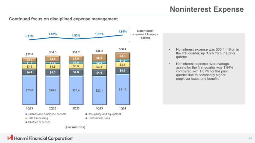 43% $2.5 24% $1.4 12% $0.7 5% $0.3 16% $0.9 Service charges on deposit accounts Trade finance and other service charges and fees Servicing income Bank - owned life insurance All other operating income Noninterest Income SBA 7(a) Loan Production and Sales ($ in millions) $34.5 $30.9 $36.1 $48.4 $30.8 $29.7 $19.9 $21.0 $29.9 $25.6 7.85% 7.75% 6.84% 6.17% 7.23% 1Q23 2Q23 3Q23 SBA Loan Sales SBA Production 4Q23 1Q24 SBA Trade Premium Noninterest income for the first quarter was $7.7 million, up 16% from the previous quarter, which included a $0.4 million gain on the sale of mortgage loans in the first quarter. Noninterest Income 1Q24 Service Charges and Fees ($ in millions) ($ in millions) $6.5 $6.7 $5.3 $5.8 $1.9 $1.2 $1.2 $1.4 ($1.9) $8.3 $7.9 $1.9 $11.2 $6.7 $7.7 $0.4 $1.5 1Q23 2Q23 3Q23 4Q23 1Q24 (1) $10.0 Gain on sale of SBA loans Securities transactions Service charges, fees & other Gain of sale of mortgage loans Legal settlements Numbers may not add due to rounding (1) Includes $4.0 million gain on the sale - and - leaseback of bank premises 20