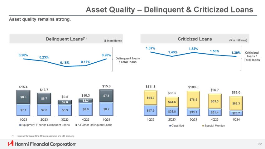 Asset Quality – Gross & Net Loan Charge - offs Gross Charge - offs Net Charge - offs Net Charge - offs / Average loans Net charge - offs for the first quarter were $1.6 million. ($ in millions) ($ in millions) $1.6 $2.6 $2.8 $1.8 $2.0 $6.6 $2.2 $0.6 $2.7 $0.1 $9.4 $1.8 $2.1 $0.1 1Q23 2Q23 3Q23 Equipment Finance Charge - offs 4Q23 1Q24 All Other Loan Charge - offs Note: Numbers may not add due to rounding $2.5 $1.2 $1.6 $2.3 ($0.6) $6.4 ($6.2) $1.5 $0.4 $1.1 $1.7 $8.9 ($5.0) 4Q23 1Q24 All Other Net Charge - offs $1.6 0.10% 0.12% 0.60% - 0.33% 0.10% 1Q23 2Q23 3Q23 Equipment Finance Net Charge - offs 24