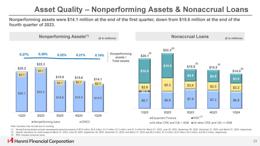 Asset Quality – Delinquent & Criticized Loans Delinquent loans / Total loans $47.3 $38.8 $33.1 $31.4 $23.7 $64.3 $44.6 $76.5 $65.3 $62.3 $111.6 $83.5 $109.6 $96.7 $86.0 1.87% 1.40% 1.82% 1.56% 1.39% 1Q23 2Q23 3Q23 4Q23 1Q24 Classified Special Mention Delinquent Loans (1) Criticized Loans Criticized loans / Total loans Asset quality remains strong. $7.1 $7.0 $6.9 $8.0 $8.2 $8.3 $6.7 $7.6 $15.4 $13.7 $9.5 $2.6 $10.3 $2.3 $15.8 0.26% 0.23% 0.16% 0.17% 0.26% 1Q23 2Q23 3Q23 Equipment Finance Delinquent Loans 4Q23 1Q24 All Other Delinquent Loans ($ in millions) 22 ($ in millions) (1) Represents loans 30 to 89 days past due and still accruing