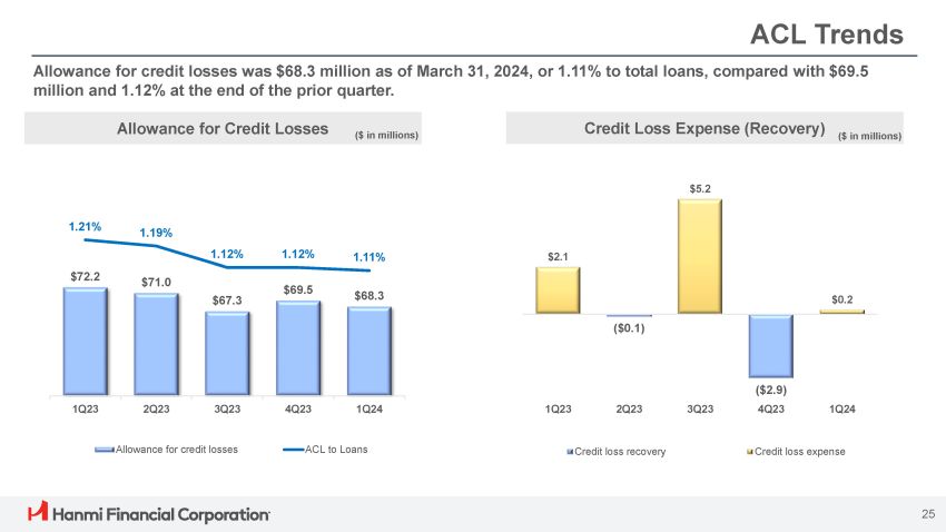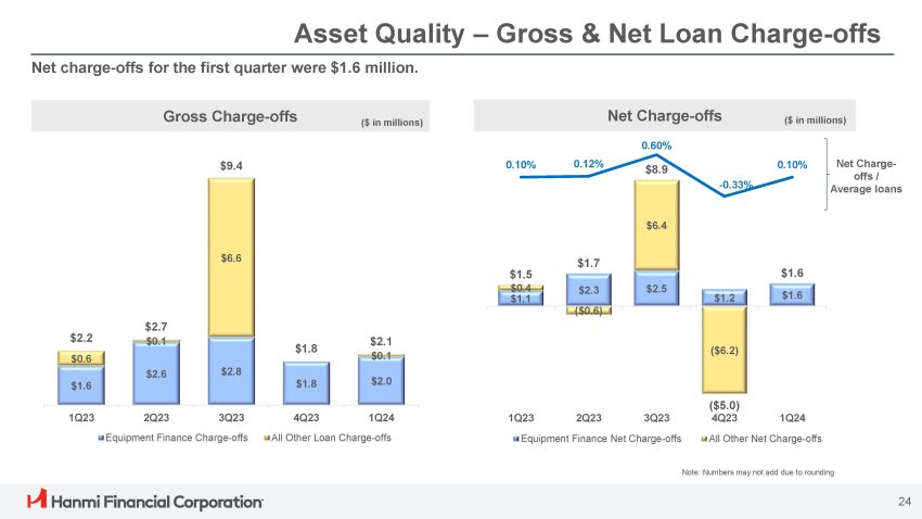 $20.1 $22.2 $15.8 $15.5 $14.0 $0.1 $0.1 $0.1 $0.1 $0.1 $20.2 $22.3 $15.9 $15.6 $14.1 4Q23 1Q24 1Q23 2Q23 3Q23 Nonperforming loans Note: Numbers may not add due to rounding OREO Asset Quality – Nonperforming Assets & Nonaccrual Loans 0.27% 0.30% 0.22% 0.21% 0.19% Nonperforming assets / Total assets Nonperforming Assets (1) Nonaccrual Loans Nonperforming assets were $14.1 million at the end of the first quarter, down from $15.6 million at the end of the fourth quarter of 2023. ($ in millions) ($ in millions) (1) Nonperforming assets exclude repossessed personal property of $0.6 million, $0.8 million, $1.3 million, $1.3 million, and $1.3 million for March 31, 2023, June 30, 2023, September 30, 2023, December 31, 2023, and March 31, 2024, respectively (2) Specific allowance for credit losses at March 31, 2023, June 30, 2023, September 30, 2023, December 31, 2023, and March 31, 2024 was $6.2 million, $7.4 million, $2.9 million, $3.4 million, and $5.3 million, respectively (3) RRE includes consumer loans $2.9 $0.5 $5.3 $3.0 $3.3 $3.2 $10.0 $10.0 $4.9 $4.9 $3.9 (2) $22.2 $15.8 $15.5 $14.0 $6.9 $7.3 $7.9 $6.9 $6.7 1Q24 4Q23 3Q23 2Q23 1Q23 Equipment Finance All other CRE and C&I < $3M RRE (3) All other CRE and C&I >= $3M 23 (2) (2) $20.1 (2) (2)