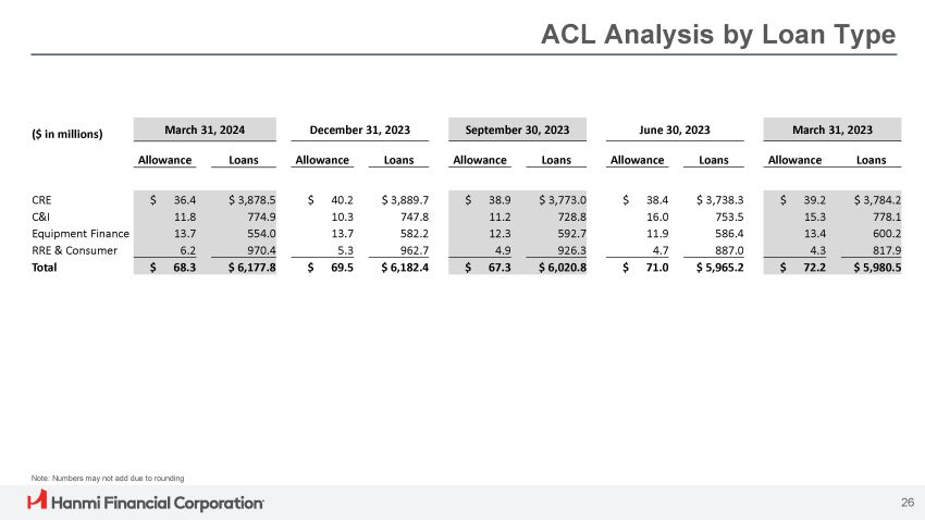 ACL Trends Allowance for credit losses was $68.3 million as of March 31, 2024, or 1.11% to total loans, compared with $69.5 million and 1.12% at the end of the prior quarter. $72.2 $71.0 $67.3 $69.5 $68.3 1.21% 1.19% 1.12% 1.12% 1.11% 1Q23 2Q23 3Q23 4Q23 1Q24 Allowance for credit losses ACL to Loans ($0.1) $2.1 $5.2 $0.2 ($2.9) 4Q23 1Q23 2Q23 3Q23 1Q24 Credit loss recovery Credit loss expense Allowance for Credit Losses Credit Loss Expense (Recovery) 25 ($ in millions) ($ in millions)