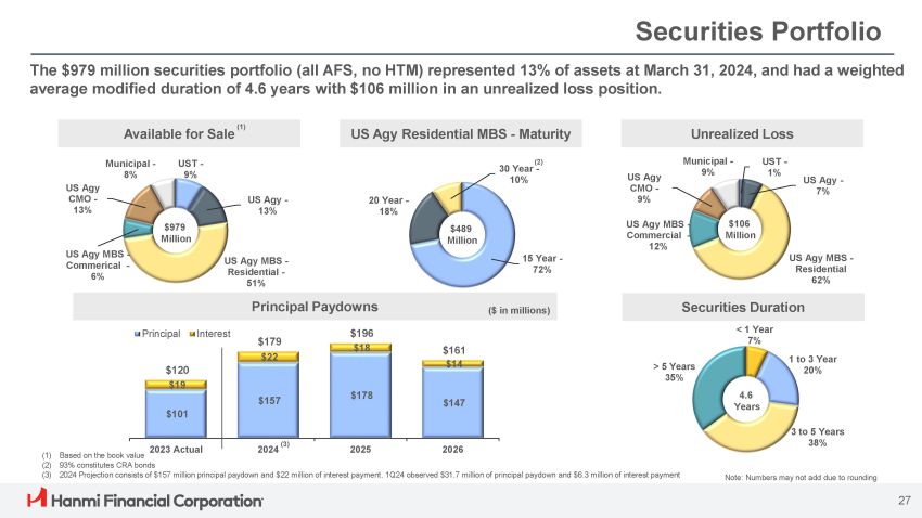 ACL Analysis by Loan Type March 31, 2023 June 30, 2023 September 30, 2023 December 31, 2023 March 31, 2024 ($ in millions) Loans Allowance Loans Allowance Loans Allowance Loans Allowance Loans Allowance $ 3,784.2 $ 39.2 $ 3,738.3 $ 38.4 $ 3,773.0 $ 38.9 $ 3,889.7 $ 40.2 $ 3,878.5 $ 36.4 CRE 778.1 15.3 753.5 16.0 728.8 11.2 747.8 10.3 774.9 11.8 C&I 600.2 13.4 586.4 11.9 592.7 12.3 582.2 13.7 554.0 13.7 Equipment Finance 817.9 4.3 887.0 4.7 926.3 4.9 962.7 5.3 970.4 6.2 RRE & Consumer $ 5,980.5 $ 72.2 $ 5,965.2 $ 71.0 $ 6,020.8 $ 67.3 $ 6,182.4 $ 69.5 $ 6,177.8 $ 68.3 Total Note: Numbers may not add due to rounding 26