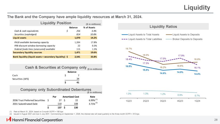 US Agy Residential MBS - Maturity 15 Year - 72% 20 Year - 18% 30 Year - 10% Securities Portfolio The $979 million securities portfolio (all AFS, no HTM) represented 13% of assets at March 31, 2024, and had a weighted average modified duration of 4.6 years with $106 million in an unrealized loss position. Principal Paydowns ($ in millions) $101 $157 $178 $147 $120 $19 $179 $22 $196 $18 $161 $14 2025 2026 Principal Interest Unrealized Loss UST - 1% US Agy - 7% US Agy MBS - Residential 62% US Agy MBS - Commercial - 12% US Agy CMO - 9% Municipal - 9% Available for Sale UST - 9% US Agy - 13% US Agy MBS - Residential - 51% US Agy MBS - Commerical - 6% US Agy CMO - 13 % Municipal - 8% $979 Million Securities Duration < 1 Year 7% 1 to 3 Year 20% 3 to 5 Years 38% > 5 Years 35% 4.6 Years $489 Million $106 Million (1) Based on the book value 2023 Actual (3) 2024 Projection consists of $157 million principal paydown and $22 million of interest payment. 1Q24 observed $31.7 million of principal paydown and $6.3 million of interest payment Note: Numbers may not add due to rounding 27 (2) 93% constitutes CRA bonds 2024 (3) (2) (1)