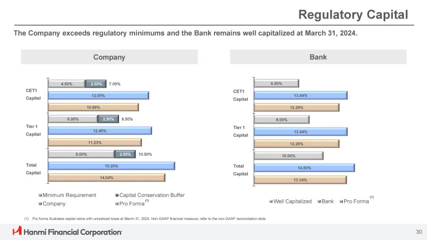 (1) Non - GAAP financial measure, refer to the non - GAAP reconciliation slides (2) Rate at the end of the quarter Capital Management Tangible book value per share (TBVPS) (1) increased to $22.86 from $22.75 at the end of the prior quarter. The increase reflects $7.5 million of net income, net of cash dividends paid, offset by a $3.4 million increase in unrealized after - tax losses on AFS securities, a $1.6 million increase in unrealized after - tax losses on cash flow hedges, and $1.6 million of stock repurchases. 3.57% 4.16% 4.61% 3.85% 4.21% ($79.1) ($84.6) ($99.4) ($71.9) ($76.9) 1Q23 2Q23 3Q23 4Q23 1Q24 AOCI $21.30 $21.56 $21.45 $22.75 $22.86 8.77% 8.96% 8.89% 9.14% 9.23% 1Q23 2Q23 3Q23 4Q23 1Q24 (1) TBVPS TBVPS (1) & TCE/TA (1) AOCI & 5 - YR TSY 5 - YR TSY (2) TCE / TA ($ in millions) (1) 29