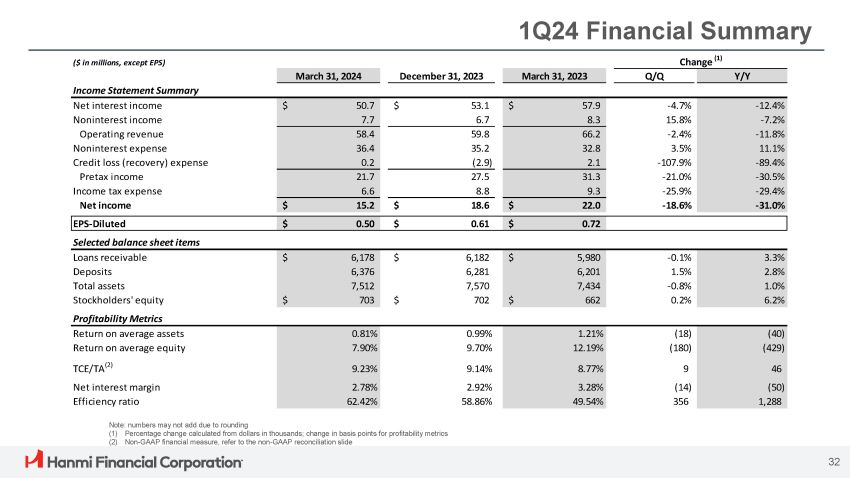 1Q24 Financial Summary Note: numbers may not add due to rounding (1) Percentage change calculated from dollars in thousands; change in basis points for profitability metrics (2) Non - GAAP financial measure, refer to the non - GAAP reconciliation slide $ 0.72 $ 0.61 $ 0.50 EPS - Diluted ($ in millions, except EPS) Change (1) March 31, 2024 December 31, 2023 March 31, 2023 Q/Q Y/Y Income Statement Summary - 12.4% - 4.7% $ 57.9 $ 53.1 $ 50.7 Net interest income - 7.2% 15.8% 8.3 6.7 7.7 Noninterest income - 11.8% - 2.4% 66.2 59.8 58.4 Operating revenue 11.1% 3.5% 32.8 35.2 36.4 Noninterest expense - 89.4% - 107.9% 2.1 (2.9) 0.2 Credit loss (recovery) expense - 30.5% - 21.0% 31.3 27.5 21.7 Pretax income - 29.4% - 25.9% 9.3 8.8 6.6 Income tax expense - 31.0% - 18.6% $ 22.0 $ 18.6 $ 15.2 Net income Selected balance sheet items 3.3% - 0.1% $ 5,980 $ 6,182 $ 6,178 Loans receivable 2.8% 1.5% 6,201 6,281 6,376 Deposits 1.0% - 0.8% 7,434 7,570 7,512 Total assets 6.2% 0.2% $ 662 $ 702 $ 703 Stockholders' equity Profitability Metrics (40) (18) 1.21% 0.99% 0.81% Return on average assets (429) (180) 12.19% 9.70% 7.90% Return on average equity 46 9 8.77% 9.14% 9.23% TCE/TA (2) (50) (14) 3.28% 2.92% 2.78% Net interest margin 1,288 356 49.54% 58.86% 62.42% Efficiency ratio 32