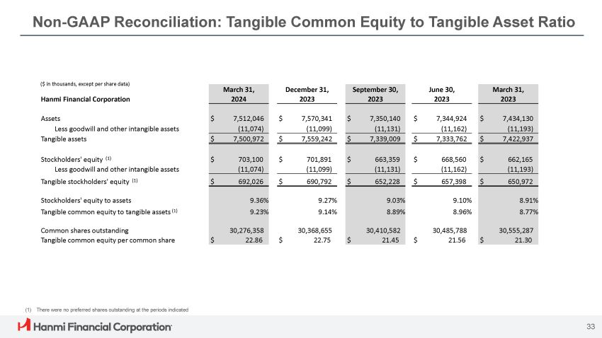 Non - GAAP Reconciliation: Tangible Common Equity to Tangible Asset Ratio 33 (1) There were no preferred shares outstanding at the periods indicated March 31, June 30, September 30, December 31, March 31, 2023 2023 2023 2023 2024 Hanmi Financial Corporation $ 7,434,130 $ 7,344,924 $ 7,350,140 $ 7,570,341 $ 7,512,046 Assets (11,193) (11,162) (11,131) (11,099) (11,074) Less goodwill and other intangible assets $ 7,422,937 $ 7,333,762 $ 7,339,009 $ 7,559,242 $ 7,500,972 Tangible assets $ 662,165 $ 668,560 $ 663,359 $ 701,891 $ 703,100 Stockholders' equity (1) (11,193) (11,162) (11,131) (11,099) (11,074) Less goodwill and other intangible assets $ 650,972 $ 657,398 $ 652,228 $ 690,792 $ 692,026 Tangible stockholders' equity (1) 8.91% 9.10% 9.03% 9.27% 9.36% Stockholders' equity to assets 8.77% 8.96% 8.89% 9.14% 9.23% Tangible common equity to tangible assets (1) 30,555,287 30,485,788 30,410,582 30,368,655 30,276,358 Common shares outstanding $ 21.30 $ 21.56 $ 21.45 $ 22.75 $ 22.86 Tangible common equity per common share ($ in thousands, except per share data)