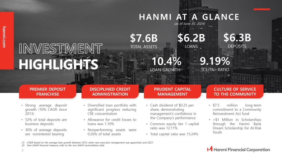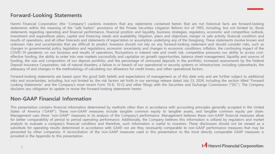 Forward - Looking Statements Hanmi Financial Corporation (the “Company”) cautions investors that any statements contained herein that are not historical facts are forward - looking statements within the meaning of the “safe harbor” provisions of the Private Securities Litigation Reform Act of 1995 , including, but not limited to, those statements regarding operating and financial performance, financial position and liquidity, business strategies, regulatory, economic and competitive outlook, investment and expenditure plans, capital and financing needs and availability, litigation, plans and objectives, merger or sale activity, financial condition and results of operations, and all other forecasts and statements of expectation or assumption underlying any of the foregoing . These statements involve known and unknown risks and uncertainties that are difficult to predict . Investors should not rely on any forward - looking statement and should consider risks, such as changes in governmental policy, legislation and regulations, economic uncertainty and changes in economic conditions, inflation, the continuing impact of the COVID - 19 pandemic on our business and results of operations, fluctuations in interest rate and credit risk, competitive pressures our ability to access cost - effective funding, the ability to enter into new markets successfully and capitalize on growth opportunities, balance sheet management, liquidity and sources of funding, the size and composition of our deposit portfolio, and the percentage of uninsured deposits in the portfolio, increased assessments by the Federal Deposit Insurance Corporation, risk of natural disasters, a failure in or breach of our operational or security systems or infrastructure, including cyberattacks, the adequacy of and changes in the methodology of calculating our allowance for credit losses, and other operational factors . Forward - looking statements are based upon the good faith beliefs and expectations of management as of this date only and are further subject to additional risks and uncertainties, including, but not limited to, the risk factors set forth in our earnings release dated July 23 , 2024 , including the section titled “Forward Looking Statements” and the Company’s most recent Form 10 - K, 10 - Q and other filings with the Securities and Exchange Commission (“SEC”) . The Company disclaims any obligation to update or revise the forward - looking statements herein . Non - GAAP Financial Information This presentation contains financial information determined by methods other than in accordance with accounting principles generally accepted in the United States of America (“GAAP”) . These non - GAAP measures include tangible common equity to tangible assets, and tangible common equity per share . Management uses these “non - GAAP” measures in its analysis of the Company’s performance . Management believes these non - GAAP financial measures allow for better comparability of period to period operating performance . Additionally, the Company believes this information is utilized by regulators and market analysts to evaluate a company’s financial condition and therefore, such information is useful to investors . These disclosures should not be viewed as a substitute for operating results determined in accordance with GAAP, nor are they necessarily comparable to non - GAAP performance measures that may be presented by other companies . A reconciliation of the non - GAAP measures used in this presentation to the most directly comparable GAAP measures is provided in the Appendix to this presentation . 2