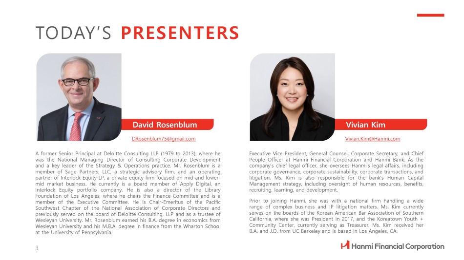 Vivian Kim Vivian.Kim@Hanmi.com David Rosenblum DRosenblum75@gmail.com Executive Vice President, General Counsel, Corporate Secretary, and Chief People Officer at Hanmi Financial Corporation and Hanmi Bank . As the company’s chief legal officer, she oversees Hanmi’s legal affairs, including corporate governance, corporate sustainability, corporate transactions, and litigation . Ms . Kim is also responsible for the bank’s Human Capital Management strategy, including oversight of human resources, benefits, recruiting, learning, and development . Prior to joining Hanmi, she was with a national firm handling a wide range of complex business and IP litigation matters . Ms . Kim currently serves on the boards of the Korean American Bar Association of Southern California, where she was President in 2017 , and the Koreatown Youth + Community Center, currently serving as Treasurer . Ms . Kim received her B . A . and J . D . from UC Berkeley and is based in Los Angeles, CA . TODAY’S PRESENTERS A former Senior Principal at Deloitte Consulting LLP ( 1979 to 2013 ), where he was the National Managing Director of Consulting Corporate Development and a key leader of the Strategy & Operations practice . Mr . Rosenblum is a member of Sage Partners, LLC, a strategic advisory firm, and an operating partner of Interlock Equity LP, a private equity firm focused on mid - and lower - mid market business . He currently is a board member of Apply Digital, an Interlock Equity portfolio company . He is also a director of the Library Foundation of Los Angeles, where he chairs the Finance Committee and is a member of the Executive Committee . He is Chair - Emeritus of the Pacific Southwest Chapter of the National Association of Corporate Directors and previously served on the board of Deloitte Consulting, LLP and as a trustee of Wesleyan University . Mr . Rosenblum earned his B . A . degree in economics from Wesleyan University and his M . B . A . degree in finance from the Wharton School at the University of Pennsylvania . 3