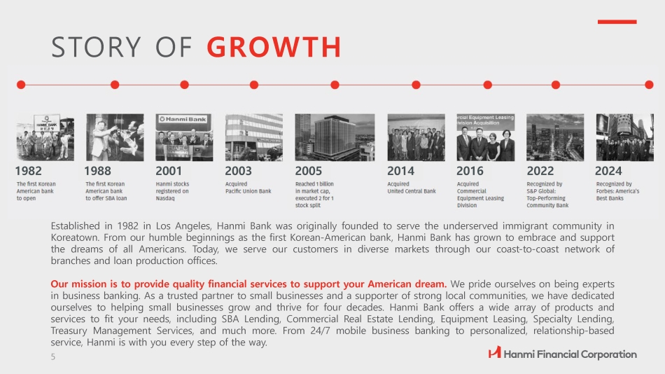 STORY OF GROWTH Established in 1982 in Los Angeles, Hanmi Bank was originally founded to serve the underserved immigrant community in Koreatown . From our humble beginnings as the first Korean - American bank, Hanmi Bank has grown to embrace and support the dreams of all Americans . Today, we serve our customers in diverse markets through our coast - to - coast network of branches and loan production offices . Our mission is to provide quality financial services to support your American dream . We pride ourselves on being experts in business banking . As a trusted partner to small businesses and a supporter of strong local communities, we have dedicated ourselves to helping small businesses grow and thrive for four decades . Hanmi Bank offers a wide array of products and services to fit your needs, including SBA Lending, Commercial Real Estate Lending, Equipment Leasing, Specialty Lending, Treasury Management Services, and much more . From 24 / 7 mobile business banking to personalized, relationship - based service, Hanmi is with you every step of the way . 1982 5 1988 2001 2003 2005 2014 2016 2022 2024