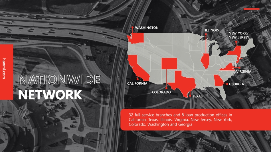 hanmi.com 32 full - service branches and 8 loan production offices in California, Texas, Illinois, Virginia, New Jersey, New York, Colorado, Washington and Georgia WASHINGTON CALIFORNIA COLORADO TEXAS GEORGIA VIRGINIA NEW YORK/ NEW JERSEY 6 ILLINOIS