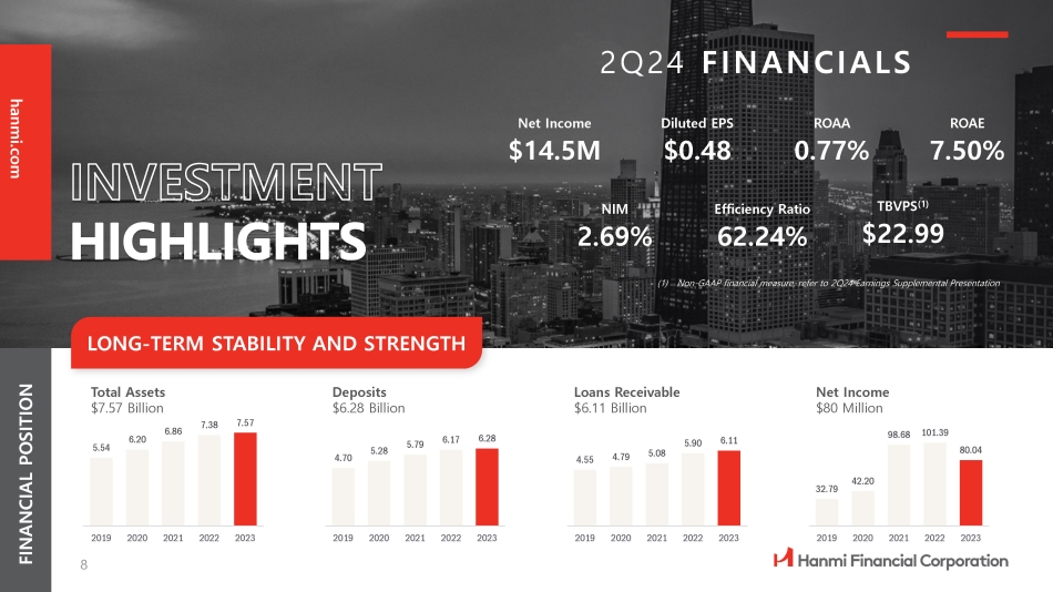 HANMI AT A GL ANCE (as of June 30, 2024) (1) CAGR based on the average loan growth between 2013, when new executive management was appointed, and 2023 (2) Non - GAAP financial measure; refer to the non - GAAP reconciliation slide $7.6B $6.2B TOTAL ASSETS LOANS $6.3B DEPOSITS 10.4% LOAN GROWTH (1) 9.19% TCE/TA (2) RATIO PREMIER DEPOSIT FRANCHISE DISCIPLINED CREDIT ADMINISTRATION PRUDENT CAPITAL MANAGEMENT CULTURE OF SERVICE TO THE COMMUNITY • Strong average deposit growth ( 10 % CAGR since 2013 ) • 52 % of total deposits are business deposits • 30 % of average deposits are noninterest bearing • Diversified loan portfolio with significant progress reducing CRE concentration • Allowance for credit losses to loans was 1 . 10 % • Nonperforming assets were 0 . 26 % of total assets • Cash dividend of $0.25 per share, demonstrating management’s confidence in the Company’s performance • Common equity tier 1 capital ratio was 12.11% • Total capital ratio was 15.24% • $ 7 . 5 million long - term commitment to a Community Reinvestment Act fund • > $ 1 Million in Scholarships through the Hanmi Bank Dream Scholarship for At - Risk Youth hanmi.com 7
