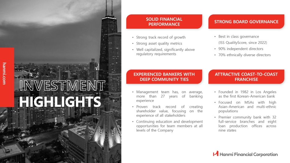 (1) Non - GAAP financial measure, refer to 2Q24 Earnings Supplemental Presentation Net Income $14.5M Diluted EPS $0.48 ROAA 0.77% ROAE 7.50% NIM 2.69% Efficiency Ratio 62.24% TBVPS (1) $22.99 2Q 24 FINANCIALS 5.54 6.20 6.86 7.38 7.57 2019 2020 2021 2022 2023 FINANCIAL POSITION 4.70 5.28 5.79 6.17 6.28 2019 2020 2021 2022 2023 4.55 4.79 5.08 5.90 6.11 2019 2020 2021 2022 2023 32.79 42.20 98.68 101.39 80.04 2019 2020 2021 2022 2023 LONG - TERM STABILITY AND STRENGTH Total Assets $7.57 Billion Deposits $6.28 Billion Loans Receivable $6.11 Billion Net Income $80 Million hanmi.com 8