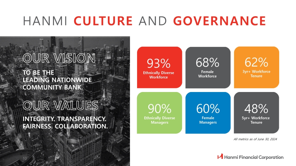 hanmi.com • Strong track record of growth • Strong asset quality metrics • Well capitalized, significantly above regulatory requirements • Founded in 1982 in Los Angeles as the first Korean - American bank • Focused on MSAs with high Asian - American and multi - ethnic populations • Premier community bank with 32 full - service branches and eight loan production offices across nine states • Best in class governance (ISS QualityScore, since 2022) • 90% independent directors • 70% ethnically diverse directors team has, 27 years • Management more than experience • Proven track on average, of banking record of creating on the shareholder value, focusing experience of all stakeholders • Continuing education and development opportunities for team members at all levels of the Company SOLID FINANCIAL PERFORMANCE STRONG BOARD GOVERNANCE EXPERIENCED BANKERS WITH DEEP COMMUNITY TIES ATTRACTIVE COAST - TO - COAST FRANCHISE 9
