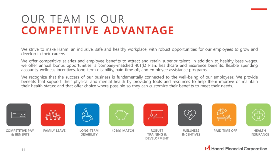 HANMI CULTURE AND GOVERNANCE INTEGRITY. TRANSPARENCY. FAIRNESS. COLLABORATION. TO BE THE LEADING NATIONWIDE COMMUNITY BANK. 68% Female Workforce 10 93% Ethnically Diverse Workforce 60% Female Managers 90% Ethnically Diverse Managers 62% 3yr+ Workforce Tenure 48% 5yr+ Workforce Tenure All metrics as of June 30, 2024
