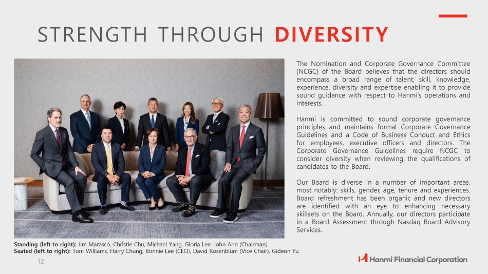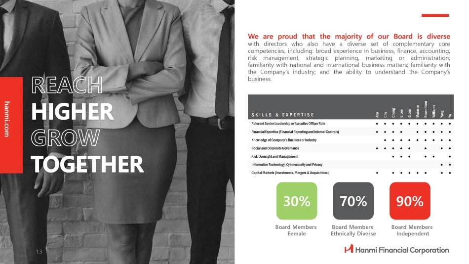The Nomination and Corporate Governance Committee (NCGC) of the Board believes that the directors should encompass a broad range of talent, skill, knowledge, experience, diversity and expertise enabling it to provide sound guidance with respect to Hanmi’s operations and interests . Hanmi is committed to sound corporate governance principles and maintains formal Corporate Governance Guidelines and a Code of Business Conduct and Ethics for employees, executive officers and directors . The Corporate Governance Guidelines require NCGC to consider diversity when reviewing the qualifications of candidates to the Board . Our Board is diverse in a number of important areas, most notably : skills, gender, age, tenure and experiences . Board refreshment has been organic and new directors are identified with an eye to enhancing necessary skillsets on the Board . Annually, our directors participate in a Board Assessment through Nasdaq Board Advisory Services . Standing (left to right): Jim Marasco, Christie Chu, Michael Yang, Gloria Lee, John Ahn (Chairman) Seated (left to right): Tom Williams, Harry Chung, Bonnie Lee (CEO), David Rosenblum (Vice Chair), Gideon Yu STRENGTH THROUGH DIVERSITY 12