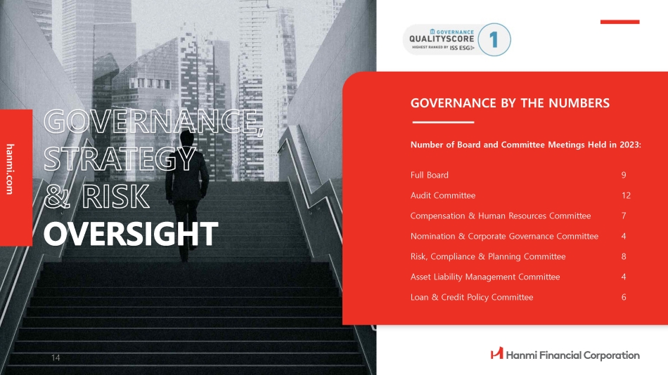 hanmi.com Number of Board and Committee Meetings Held in 2023: 9 Full Board 12 Audit Committee 7 Compensation & Human Resources Committee 4 Nomination & Corporate Governance Committee 8 Risk, Compliance & Planning Committee 4 Asset Liability Management Committee 6 Loan & Credit Policy Committee GOVERNANCE BY THE NUMBERS 14