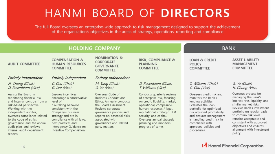 COMPENSATION & HUMAN RESOURCES COMMITTEE RISK, COMPLIANCE & PLANNING COMMITTEE AUDIT COMMITTEE HANMI BOARD OF DIRECTORS LOAN & CREDIT POLICY COMMITTEE ASSET LIABILITY MANAGEMENT COMMITTEE The full Board oversees an enterprise - wide approach to risk management designed to support the achievement of the organization’s objectives in the areas of strategy, operations, reporting and compliance HOLDING COMPANY Entirely Independent H. Chung (Chair) D. Rosenblum (Vice) Assists the Board in monitoring financial risk and internal controls from a risk - based perspective. Working with the independent auditor, oversees compliance related to the code of ethics, governance, and the annual audit plan, and reviews internal audit department reports. 16 Entirely Independent C. Chu (Chair) G. Lee (Vice) Ensures incentives encourage a conservative level of risk - taking behavior consistent with the Company’s business strategy and are in compliance with all laws, best practices and Interagency Guidance on Incentive Compensation. NOMINATION & CORPORATE GOVERNANCE COMMITTEE Entirely Independent M. Yang (Chair) G. Yu (Vice) Oversees Code of Business Conduct and Ethics. Annually conducts the Board assessment. Reviews corporate governance policies and reports on potential risks associated with governance and related party matters. D. Rosenblum (Chair) T. Williams (Vice) Conducts quarterly reviews of enterprise risk, focusing on credit, liquidity, market, operational, compliance, human resources / legal, reputational, strategic, IT & security, and capital. Oversees annual strategic planning and monitors progress of same. T. Williams (Chair) C. Chu (Vice) Oversees credit risk and monitors the Bank’s lending activities. Evaluates the loan portfolio for optimized risk adjusted profitability and ensures management is handling credit risk in compliance with approved policies and procedures. G. Yu (Chair) H. Chung (Vice) Oversees process for managing the Bank’s interest rate, liquidity, and similar market risks. Reviews Bank’s investment portfolio on regular basis to confirm risk level remains acceptable and consistent with approved objectives and ensures alignment with investment policy.