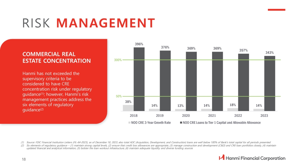 COMMERCIAL REAL ESTATE CONCENTRATION Hanmi has not exceeded the supervisory criteria to be considered to have CRE concentration risk under regulatory guidance (1) ; however, Hanmi’s risk management practices address the six elements of regulatory guidance (2) RISK MANAGEMENT (1) Source: FDIC Financial Institution Letters (FIL - 64 - 2023), as of December 18, 2023; also total ADC (Acquisition, Development, and Construction) loans are well below 100% of Bank’s total capital for all periods presented (2) Six elements of regulatory guidance – (1) maintain strong capital levels, (2) ensure that credit loss allowances are appropriate, (3) manage construction and development (C&D) and CRE loan portfolios closely, (4) maintain updated financial and analytical information, (5) bolster the loan workout infrastructure, (6) maintain adequate liquidity and diverse funding sources 38% 14% 13% 14% 18% 14% 396% 376% 369% 369% 357% 343% 2018 2019 NOO CRE 3 - Year Growth Rate 2020 2021 2022 2023 NOO CRE Loans to Tier 1 Capital and Allowable Allowance 300% 50% 18