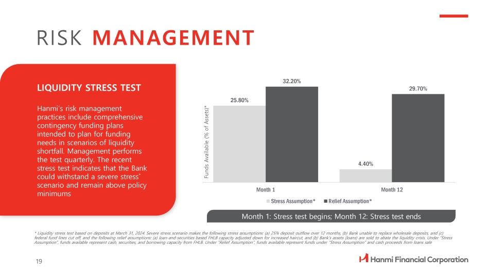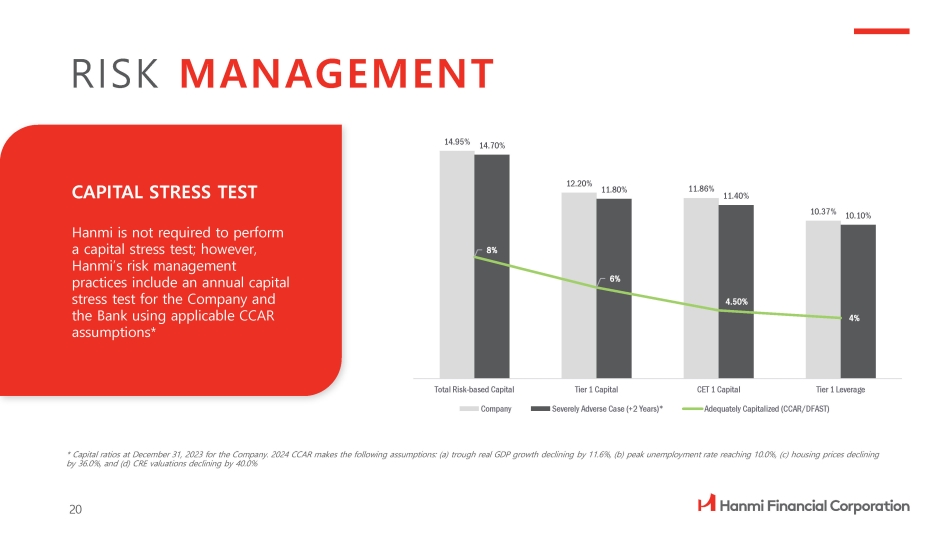 LIQUIDITY STRESS TEST Hanmi’s risk management practices include comprehensive contingency funding plans intended to plan for funding needs in scenarios of liquidity shortfall. Management performs the test quarterly. The recent stress test indicates that the Bank could withstand a severe stress * scenario and remain above policy minimums RISK MANAGEMENT * Liquidity stress test based on deposits at March 31, 2024. Severe stress scenario makes the following stress assumptions: (a) 25% deposit outflow over 12 months, (b) Bank unable to replace wholesale deposits, and (c) federal fund lines cut off, and the following relief assumptions: (a) loan - and - securities based FHLB capacity adjusted down for increased haircut, and (b) Bank’s assets (loans) are sold to abate the liquidity crisis. Under “Stress Assumption”, funds available represent cash, securities, and borrowing capacity from FHLB. Under “Relief Assumption”, funds available represent funds under “Stress Assumption” and cash proceeds from loans sale 25.80% 4.40% 32.20% 29.70% Month 12 Month 1 Stress Assumption* Relief Assumption* Month 1: Stress test begins; Month 12: Stress test ends Funds Available (% of Assets)* 19